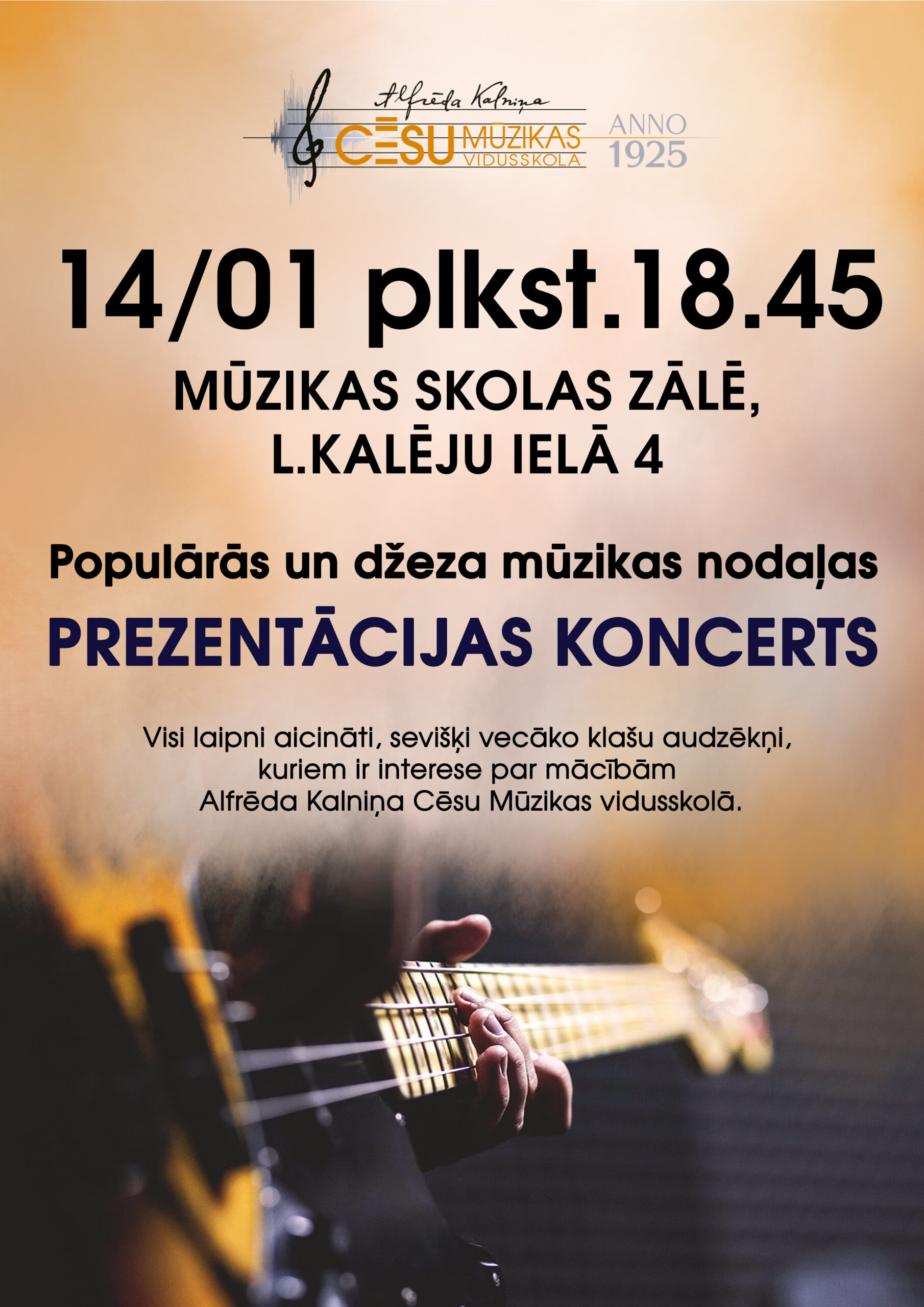 14.janvārī plkst. 18.45 Cēsu Mūzikas skolas zālē, L. Kalēju ielā 4, Alfrēda Kalniņa Cēsu Mūzikas vidusskolas Populārās un džeza mūzikas programmas audzēkņi un pedagogi aicina uz prezentācijas koncertu.