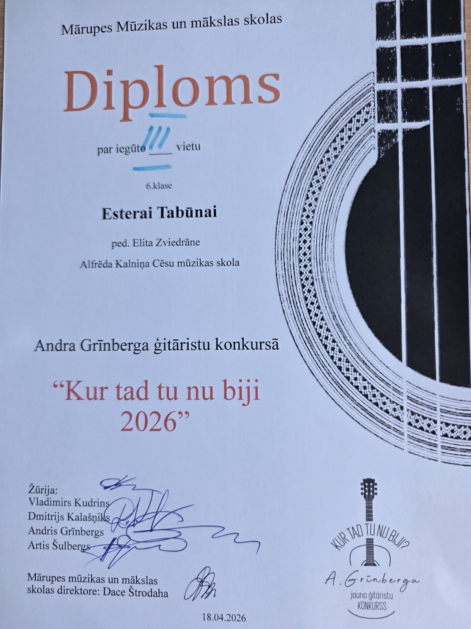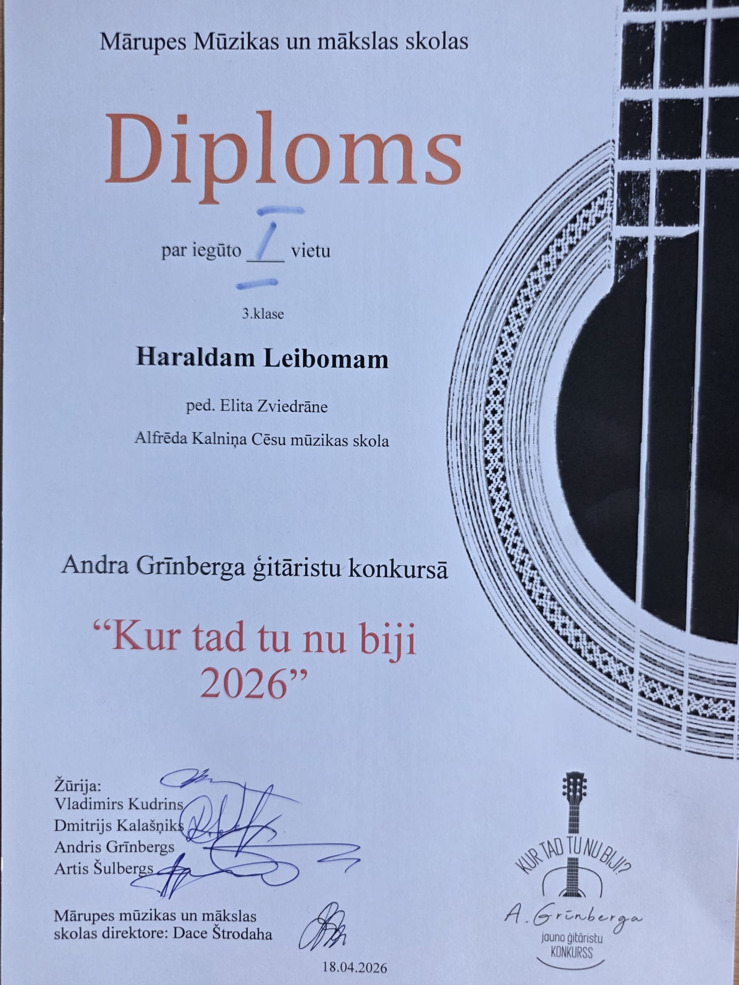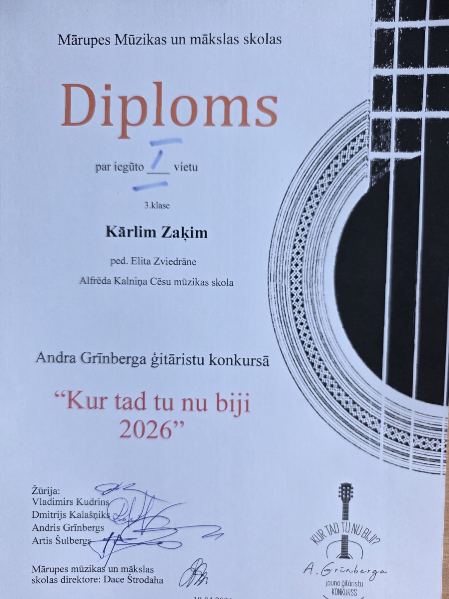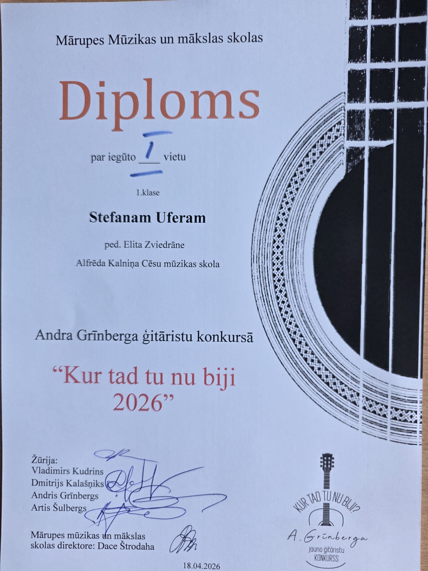 Aizvadītajā nedēļā, 18. aprīlī, noslēdzies Starptautiskais ģitāristu konkurss “Kur tad tu nu biji 2026”, kuru rīkoja Mārupes Mūzikas un mākslas skola sadarbībā ar ģitāras pedagogu, mūziķi un dziesmu aranžētāju Andri Grīnbergu. Konkursā piedalījās vairāk nekā 40 dalībnieki no dažādām Latvijas mūzikas skolām un ārvalstīm, demonstrējot augstu muzicēšanas līmeni un daudzveidīgo repertuāru. Pedagogiem un viņu audzēkņiem bija lieliska iespēja piedalīties arī Lielkoncertā gan spēlējot solo, gan kopīgi muzicējot.